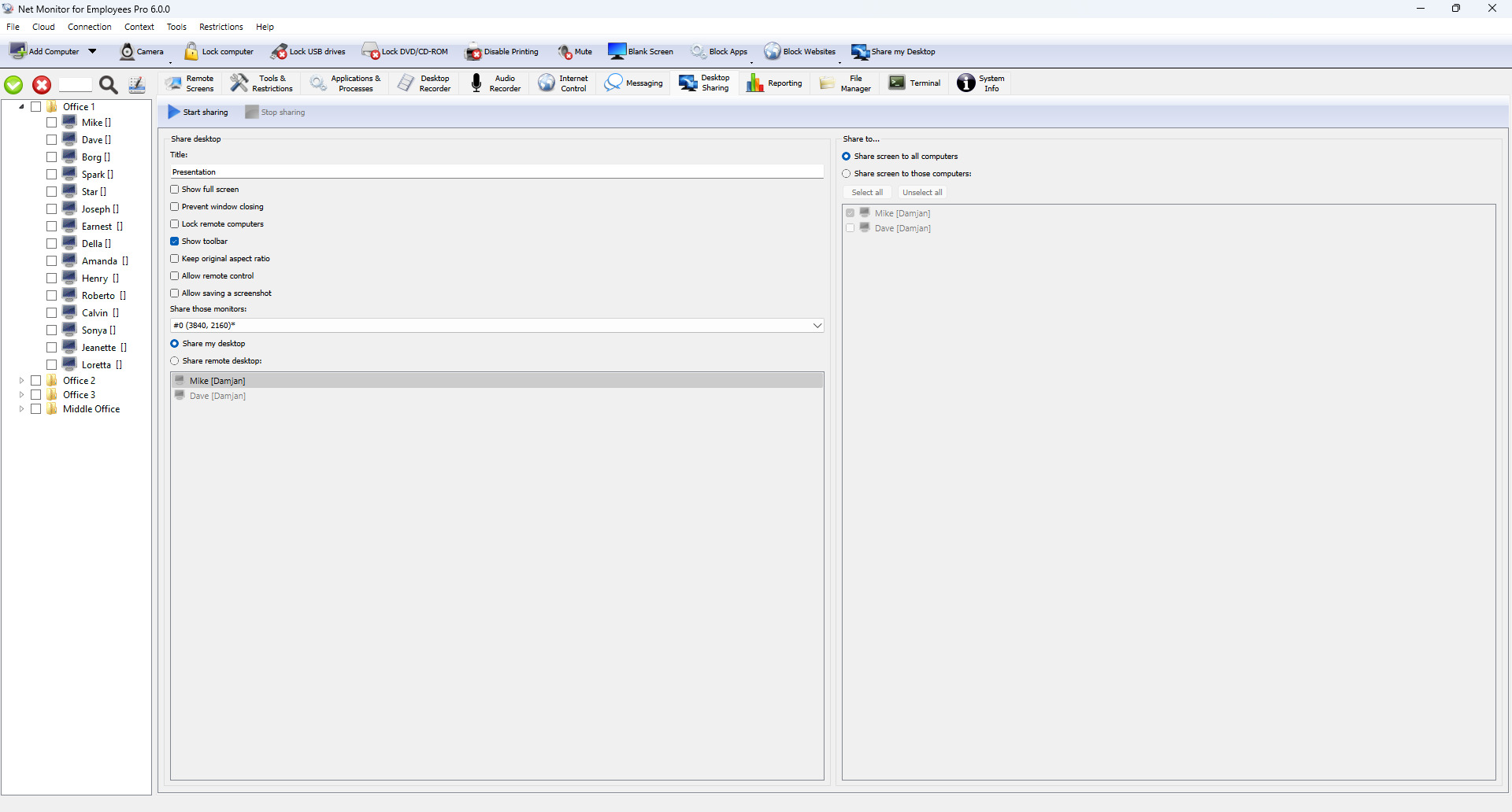 الإشراف على نشاط الموظفين من خلال مشاهدة وتسجيل شاشات الكمبيوتر الحية ، وسجل تصفح الويب ، واستخدام التطبيقات ، وضغطات المفاتيح المضغوطة ...