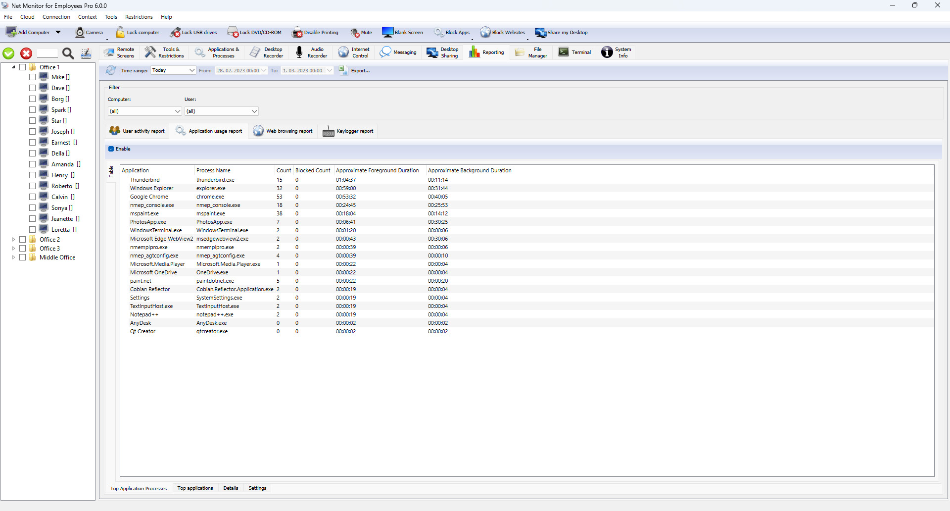 تتيح لك وظيفة التسجيل وإعداد التقارير تتبع استخدام تطبيق الموظف أو العملية ، مثل التطبيقات التي تم استخدامها ومدة استخدامها.